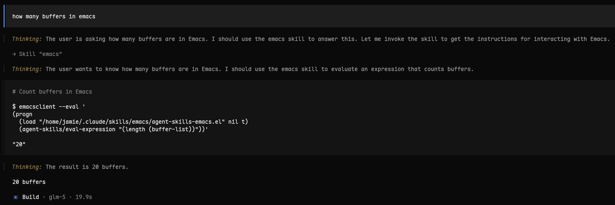 最近被 GitHub - xenodium/emacs-skills: Emacs skills for coding agents · GitHub agent-shell 作者启发,写了一个 emacs skill 感觉还不错分享一下