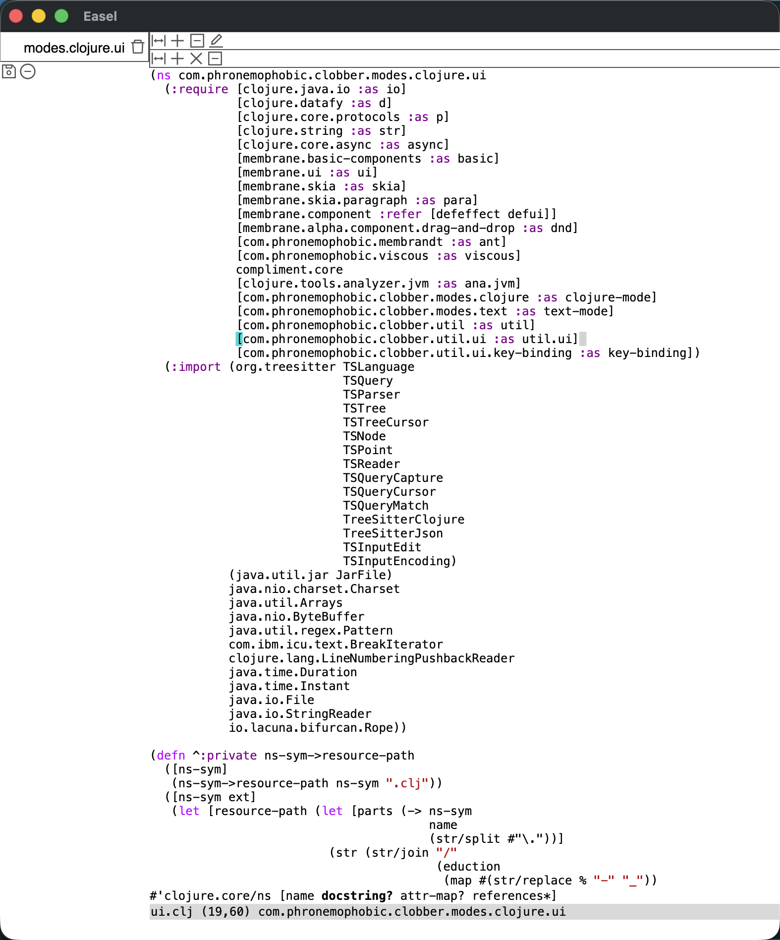 Easel 本身相对专注。它提供了一个用于指定工具的模型,以及一个简单的用户界面,用于在同一窗口中排列工具。IDE 预期的大部分功能都是通过可以相互共享数据的简单、模块化工具提供的。工具也可以在 Easel 之外独立使用。将其视为一个库。一些工具的例子包括文本编辑、终端仿真、数据检查、网页浏览等。