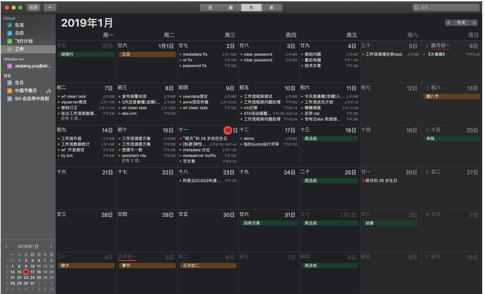 我的事务管理的核心是要将每天做的事项同步到日历中进行记录,以便于我查看某一天我做了哪些工作,某项工作都是在哪些时间完成的。类似下图
