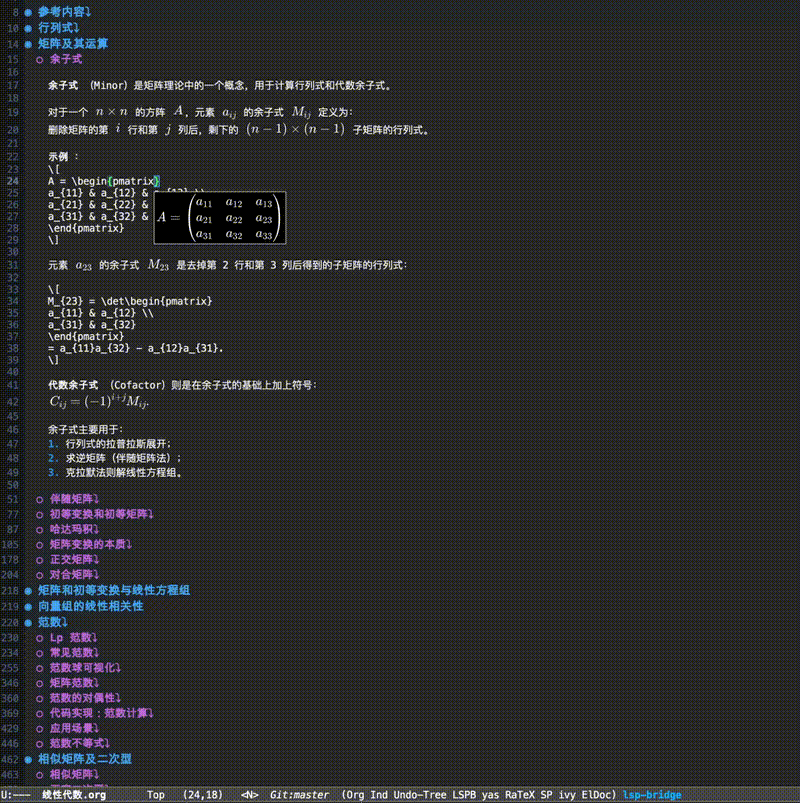 我花了一个下午时间集成进emacs里面的,功能还比较少,现在还只支持全局一起渲染,没支持区域渲染。不过我最大的就是这个纯性代数笔记,渲染它也基本没有延迟,所以虽然不支持只渲染部分,但问题也不算很大。
