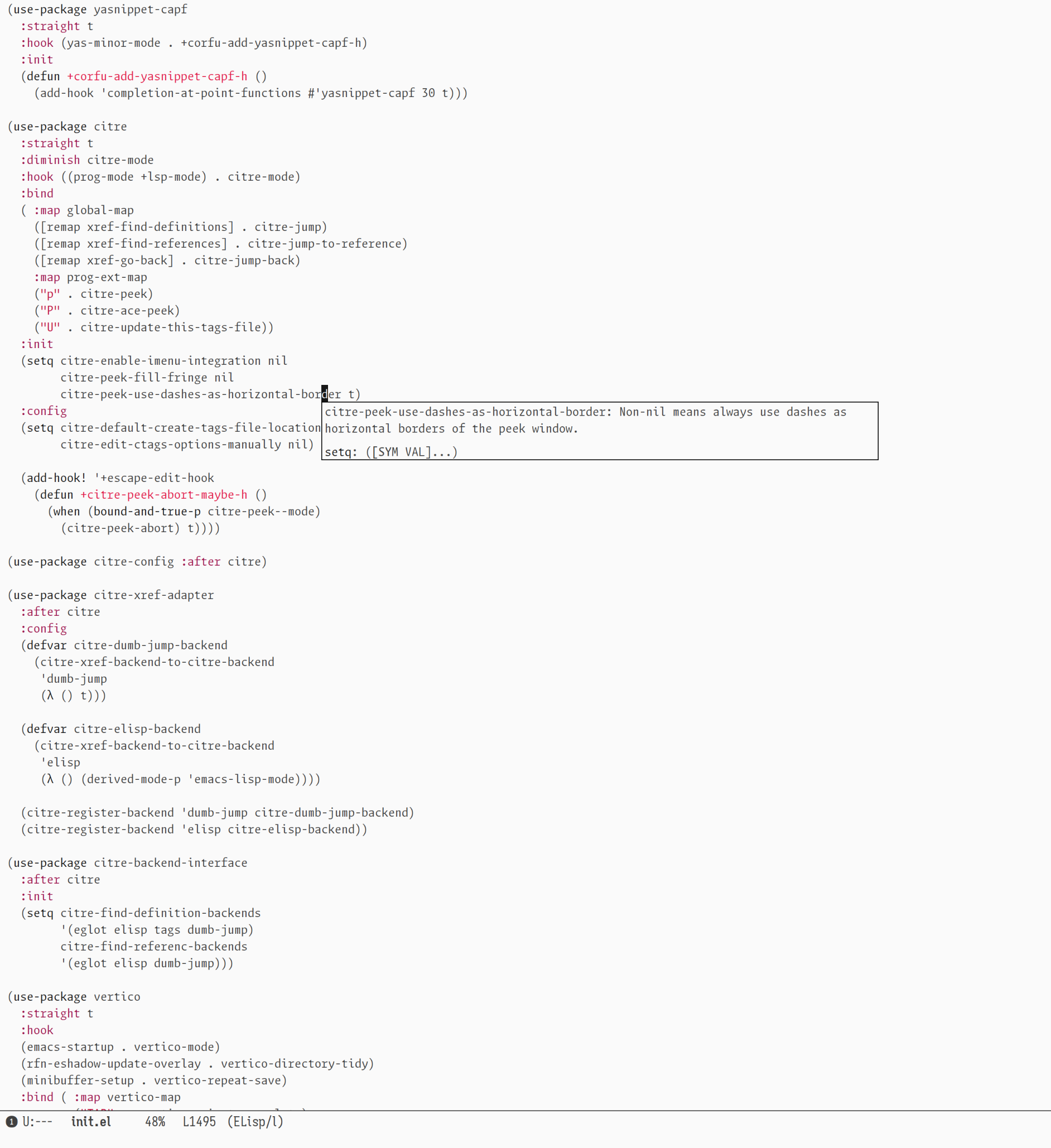 我是习惯了 color-theme-sanityinc-tomorrow 中的 sanityinc-tomorrow-bright,从 Emacs 26.1 开始用,一直到现在。中间换过多次别的主题,最后都是换回来了。zenburn 和 modus 系列都试过。Zenburn 感觉对比度太低(据说对眼睛比较好),不好区分, modus 的深色主题对比又太高。