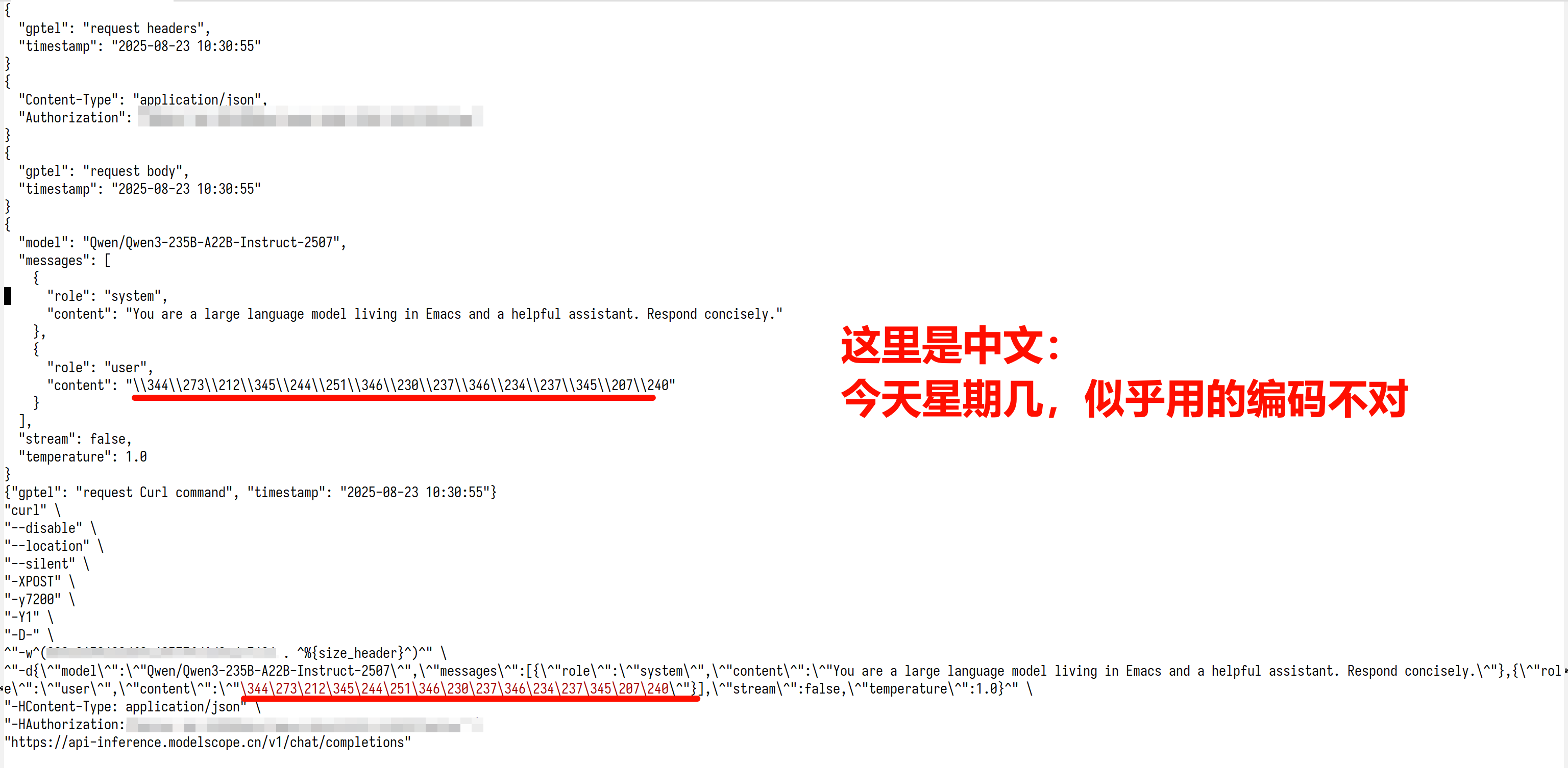 在使用 gptel 的时候,如何设置 coding-system?我用英文提问,没问题。但如果用中文提问,gptel 就会出现问题。下面是 gptel-log