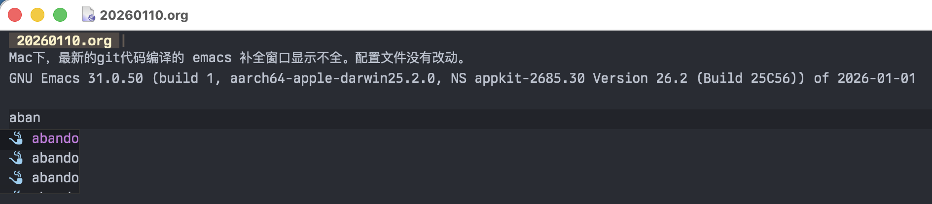 Mac下,最新的git代码编译的 emacs 补全窗口显示不全。