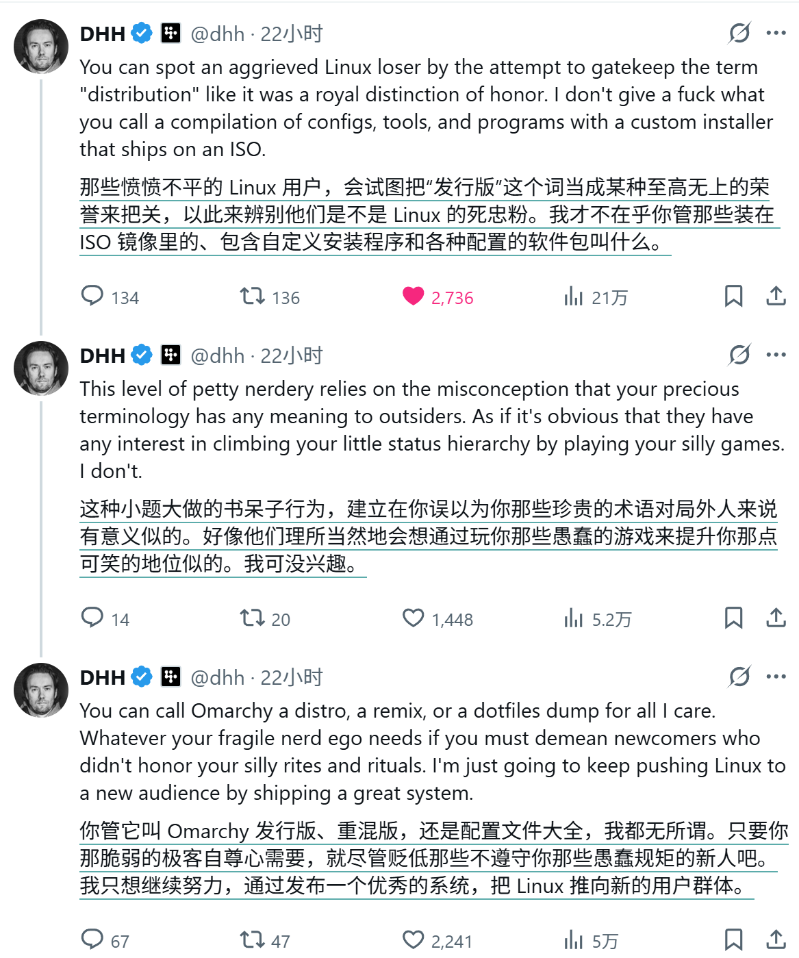 当然,DHH 和他的支持者是不会在意这些事的。平常自称 “Beautiful, Modern Linux”,在推特上跟别人推销自己是新人友好的“发行版”,拿了 Arch Linux 和 hyprland 望尘莫及的赞助;有人批评系统哪里不够 robust,安排得不够好,就说 omarchy 一开始只是 “DHH’s Opinionated dotfiles”;临了还要嘲讽别人“你们这些书呆子分那么清干嘛,就是你们害得 Linux 桌面没新人”。便宜都叫他占完了。