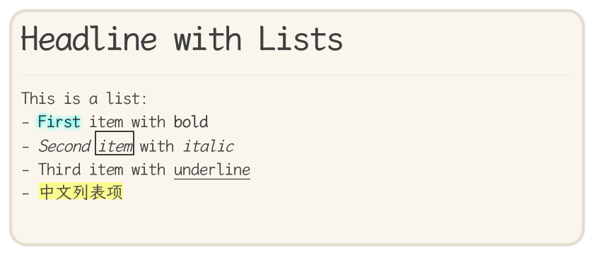 - 生成卡片:光标放在 Org headline 上,执行 M-x org-headline-card-at-point