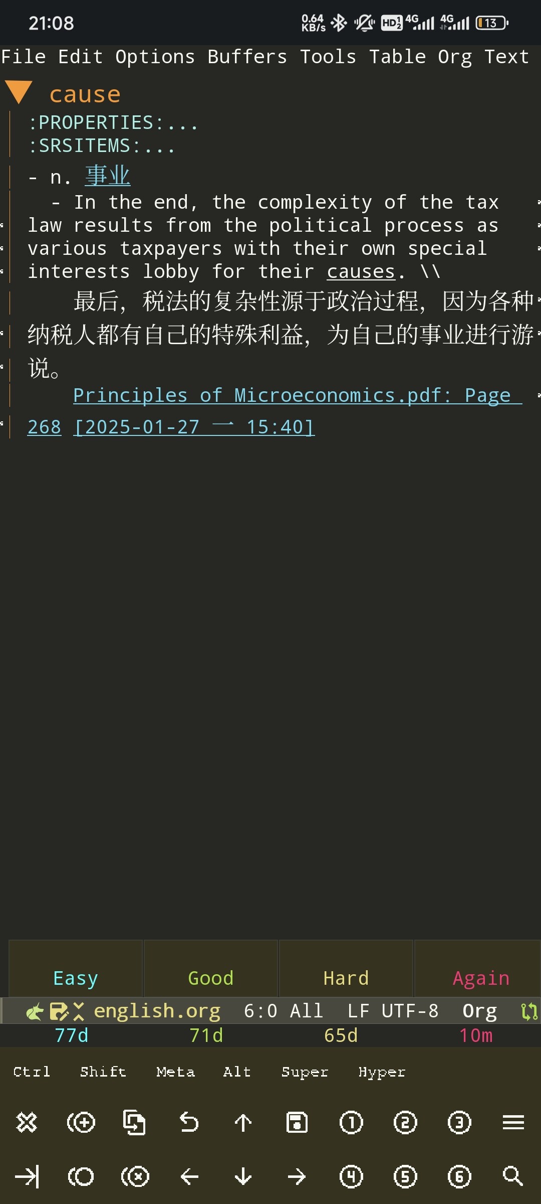 - 如果每次仅进行简单的文本形式的复习却需要离开 Emacs ,对我个人而言有点不太能接受, 再加上在 Android 端已经有原生的 Emacs 可用, Emacs 的跨平台性和便携性对于我这个 Android 用户而言已经不再是问题, 所以我跳过了继续深入这种方案。