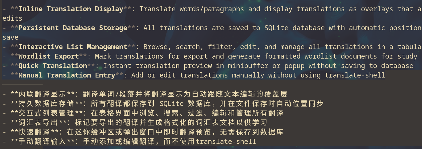 用同样的逻辑再补一个类似的工具trans-overlay,这个项目受emacs-immersive-translate 和 dictionary-overlay的启发。单词翻译可以跟随单词移动。整行的翻译可以放在下一行,同样跟随移动。