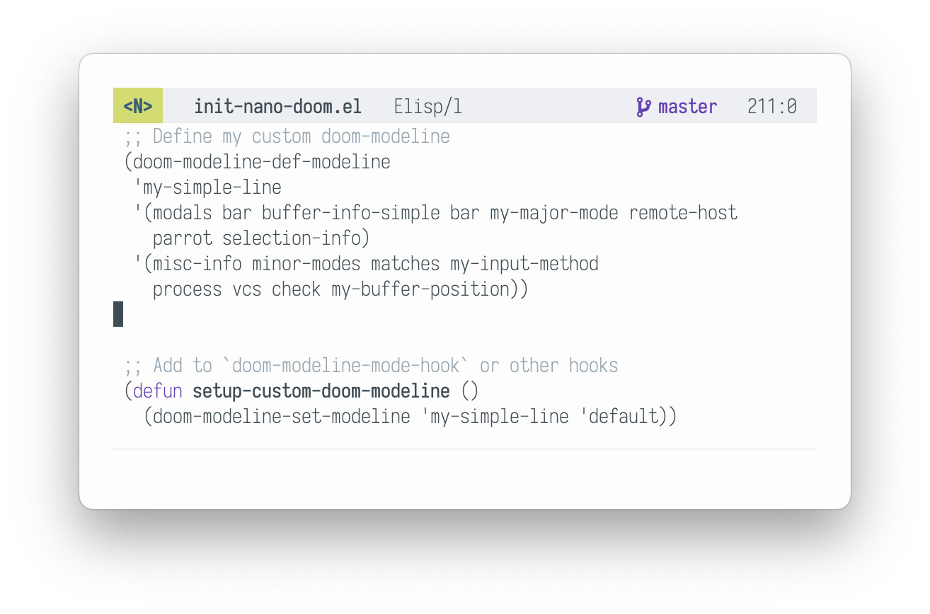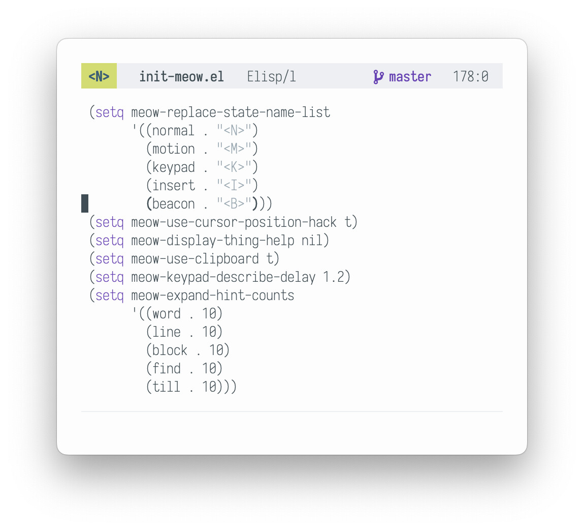 你这个应该是nano的modeline吧,我github搜索了一下,cat-emacs/cats/+meow.el at 75a827b87ebc8643ae30524d692ae80d08354b8c · chuxubank/cat-emacs · GitHub 类似这样折腾,也挺麻烦的。在doom的modeline上可能也得这么折腾。如果直接安照你那个配置,实际也不起效。