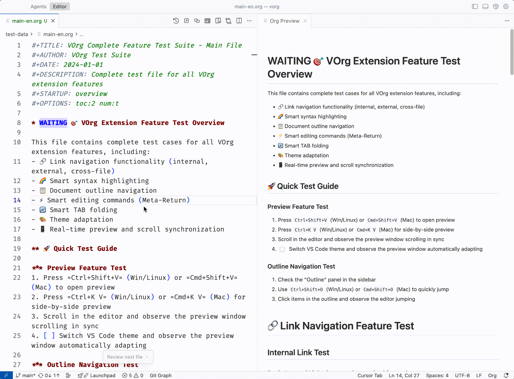 由于我越来越依赖 Cursor 的 AI 功能进行日常开发,因此希望在 VS Code/Cursor 中实现 org-mode 的顺利编辑能力。这就是我开发 VOrg 的初衷——在 org-mode 强大的笔记结构与 Cursor 提供的现代 AI 辅助编辑体验之间搭建桥梁。最近把自己用来写笔记的小工具整理成了一个 VS Code 扩展:VOrg。它不是要"复刻" Emacs 的 Org-mode,而是尽量在 VS Code 里把常用的基础功能做得可用、顺手,重点放在预览体验和一些 org-like 的编辑辅助上。相比 Emacs 中的 org-mode,VOrg 的一个优势是提供了实时预览和预览窗口跟随编辑器滚动的功能,让编辑和预览体验更加流畅。发出来给也在 VS Code 写 Org 的朋友看看,欢迎随便试用、提意见,别客气。