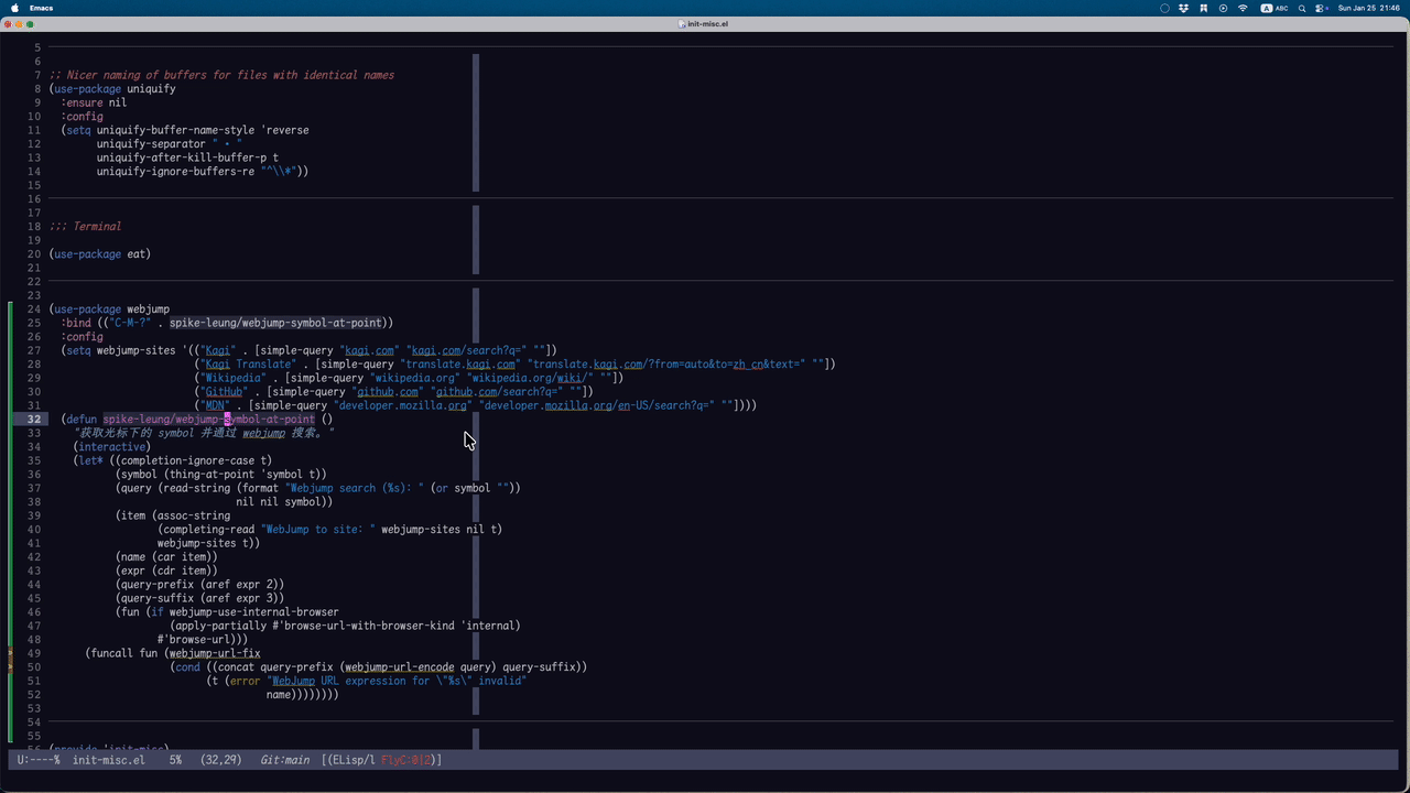 我觉得用来搜索 point 下的内容也挺好的,就糊了个简单函数,用来搜索 symbol-at-point 的内容,例如用 Kagi 搜索、Kagi 翻译、搜索 GitHub、MDN 等常用文档。