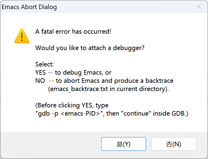 A fatal error has occurred! Would you like to attach a debugger? Select: YES 一 to debug Emacs , or NO 一 to abort Emacs and produce a backtrace (emacs_backtrace.txt in current directory).